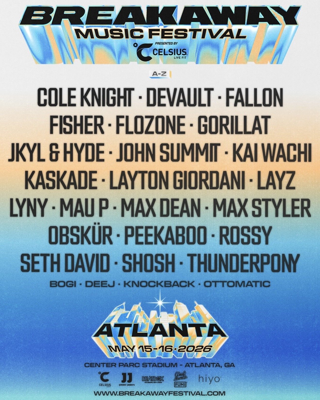 BREAKAWAY MUSIC FESTIVAL PRESENTED BY CELSIUS® RETURNS TO ATLANTA may 15-16, 2026, FEATURING FISHER, JOHN SUMMIT, KASKADE, MAU P AND MORE AT Center PARC STADIUM